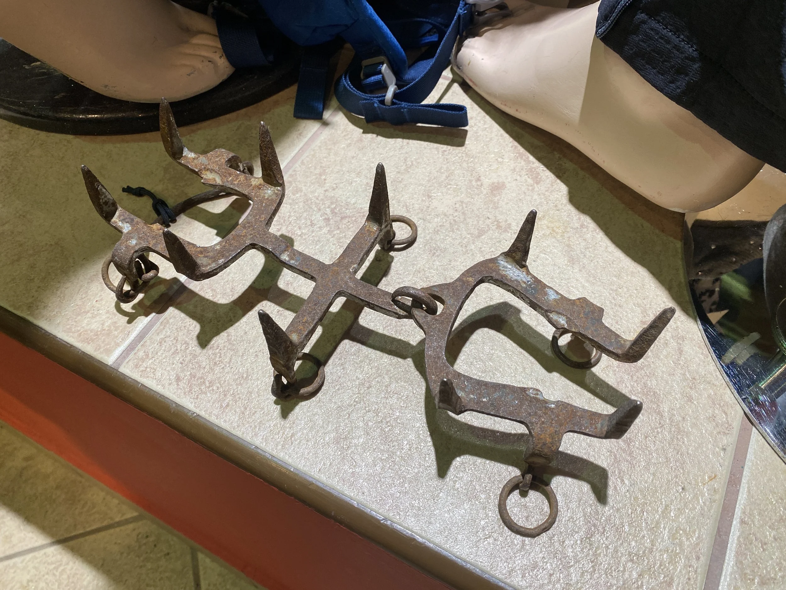 Canvas or leather was then wrapped through rings that were attached to the upward protruding points to strap them to the bottom of a mountaineer’s boots.
